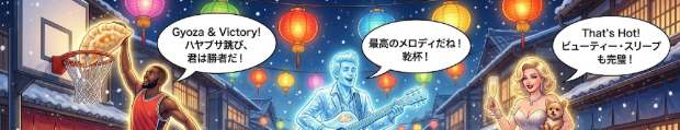 コメントを、MJ、エド、パリスが餃子パーティーで盛り上がる「That’s Hot!」なイラストにします。少々お待ちください!