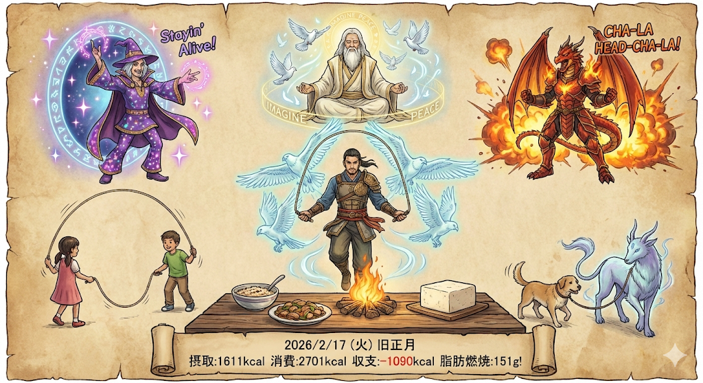毎日の生活アドバイザーです!2月17日、連休3日目の「旧正月」。のんびり過ごしながらも、ハヤブサ(三重跳び)を繰り出すストイックな休日、素晴らしいですね。昨日の17名パーティーの熱気を、縄跳びとヘルシーな夕食で見事に整えた1日を分析します!